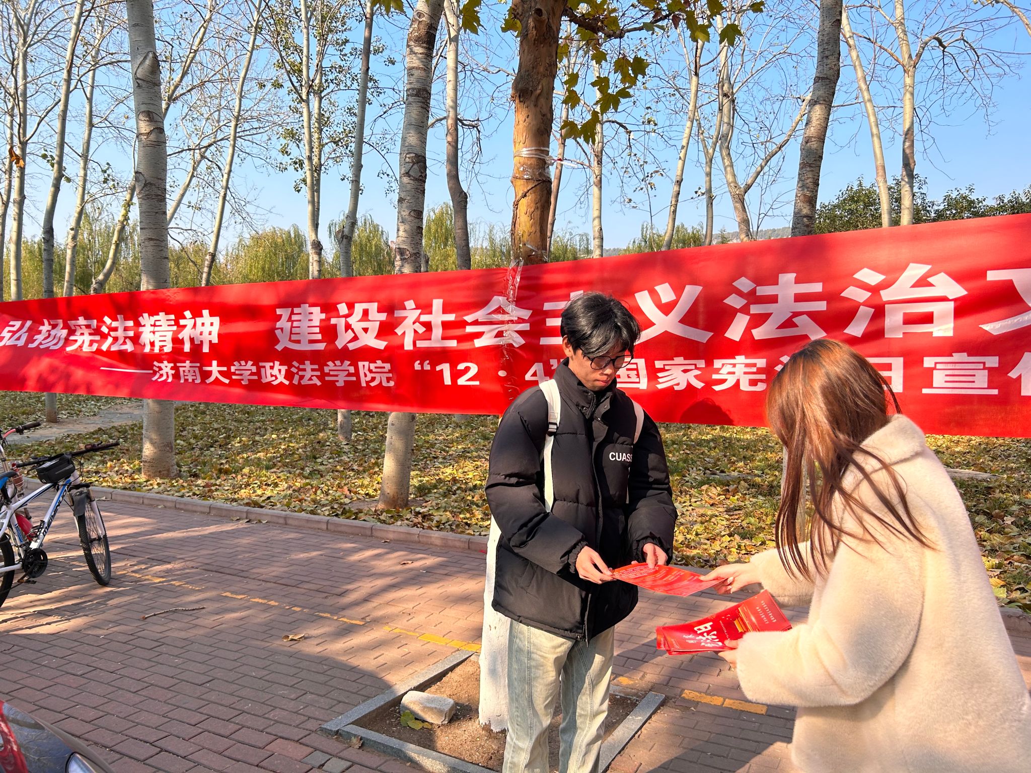 学生会成员向同学们发放宪法宣传页,法学专业学生开展宪法知识讲解。参与同学认真阅读宪法条文,积极发表自己对宪法的认识和感悟,提出自己的问题,用心体会宪法的内在含义。活动结束后同学们纷纷表示将不断加强对宪法的学习和宣传,提高法治意识和法律素养,自觉尊崇宪法、学习宪法、遵守宪法、维护宪法。