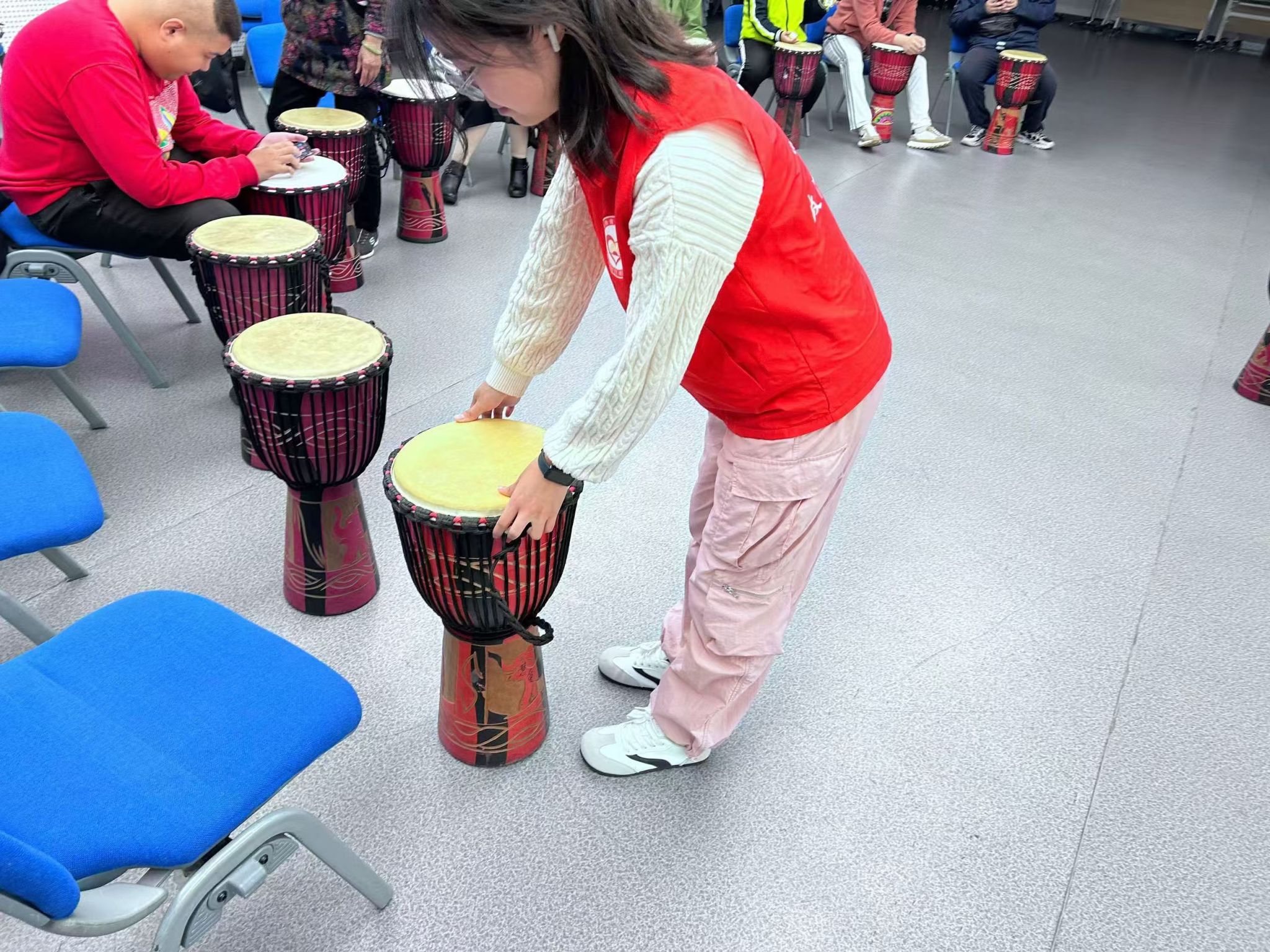 活动当天,志愿者们早早到达现场,为活动做准备。随后,他们面带微笑,热情地迎接每一位前来上课的残障儿童,用温暖和关爱为孩子们营造一个轻松愉悦的学习氛围。在专业老师的悉心指导下,孩子们投入到非洲鼓的学习中,他们认真聆听老师的讲解,仔细观察老师的示范,在老师教学完毕后,就迫不及待地拿起鼓槌,开始尝试敲击,教室里立刻回荡起了此起彼伏的击鼓声。随着教学的深入,孩子们逐渐找到了节奏,他们的敲击声愈发整齐而沉厚有力。在志愿者的陪伴下,孩子们渐渐释放自我,用歌声和鼓声表达他们内心的喜悦,使整个教室都洋溢着欢快的氛围。此次活动,为残障儿童带来了学习新技能的机会,帮助他们在音乐中找到乐趣,释放压力,促进了他们的心理健康。