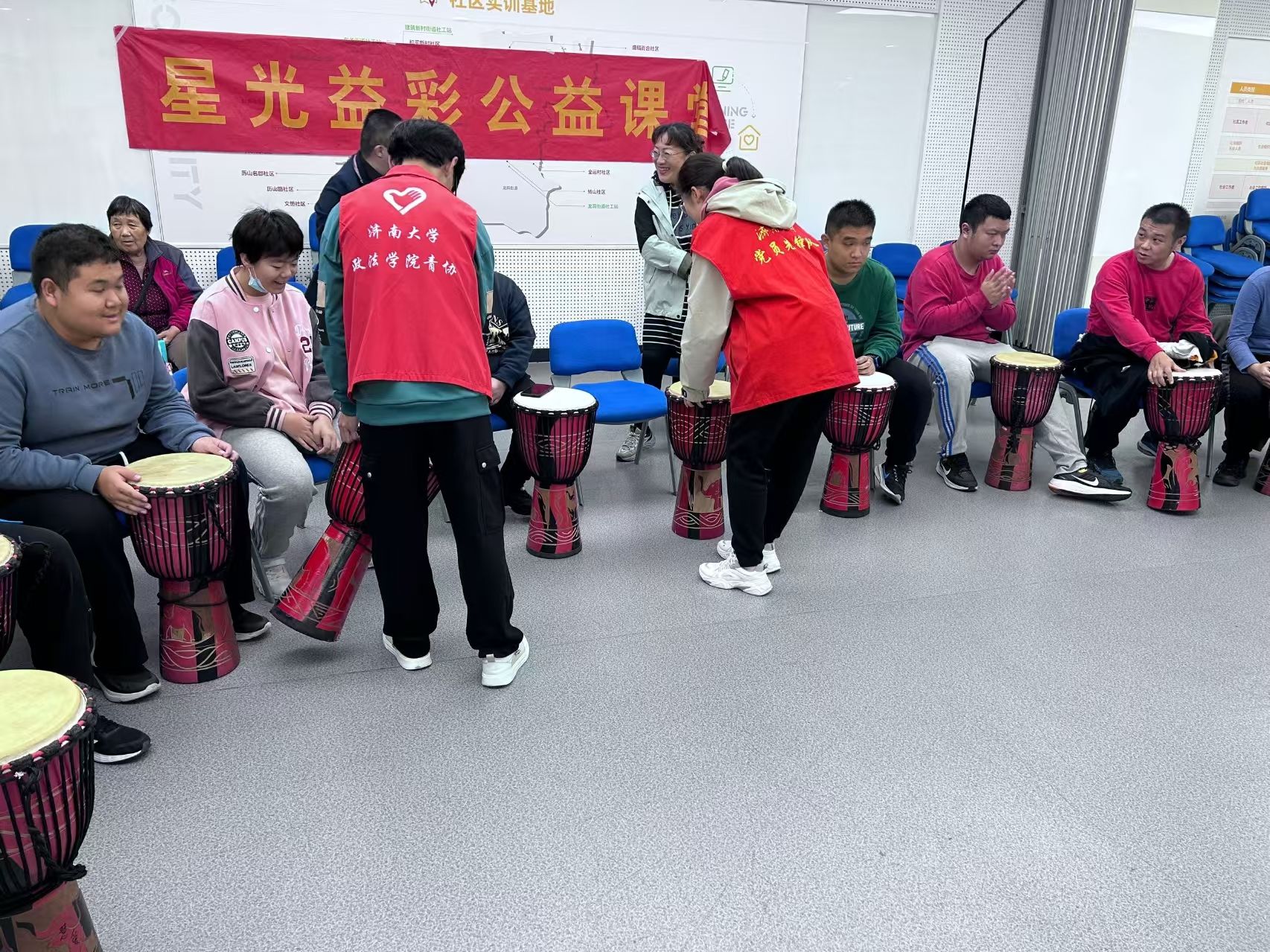 阳光先锋青年志愿者协会的志愿者们前往济南市慧爱残疾人服务中心,开展了一场别开生面的非洲鼓公益课程。旨在通过音乐疗法丰富残障儿童的文体生活,激发他们的内在潜能,增强身心健康。