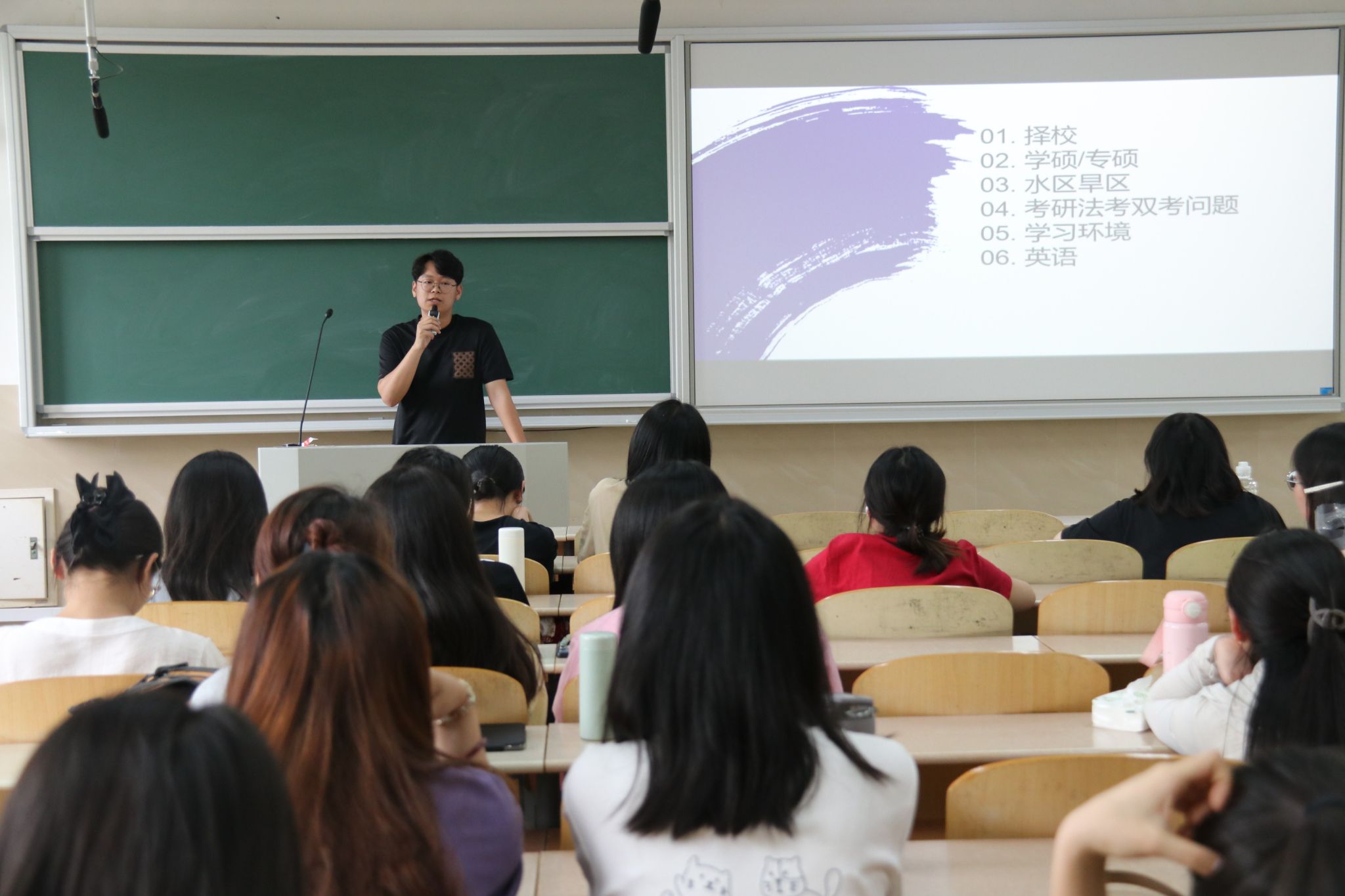 在互动环节,与会同学积极提问,就自己关心的具体问题与分享的学长学姐展开深入交流。现场气氛热烈,思想的火花不断碰撞。三位辅导员老师也结合多年工作经验,为同学们提供了专业的指导和建议,帮助大家更清晰地规划未来的升学路径。与会同学纷纷表示,通过此次活动,他们对推免和考研有了更清晰的认识,也更加明确了自己的学业规划。