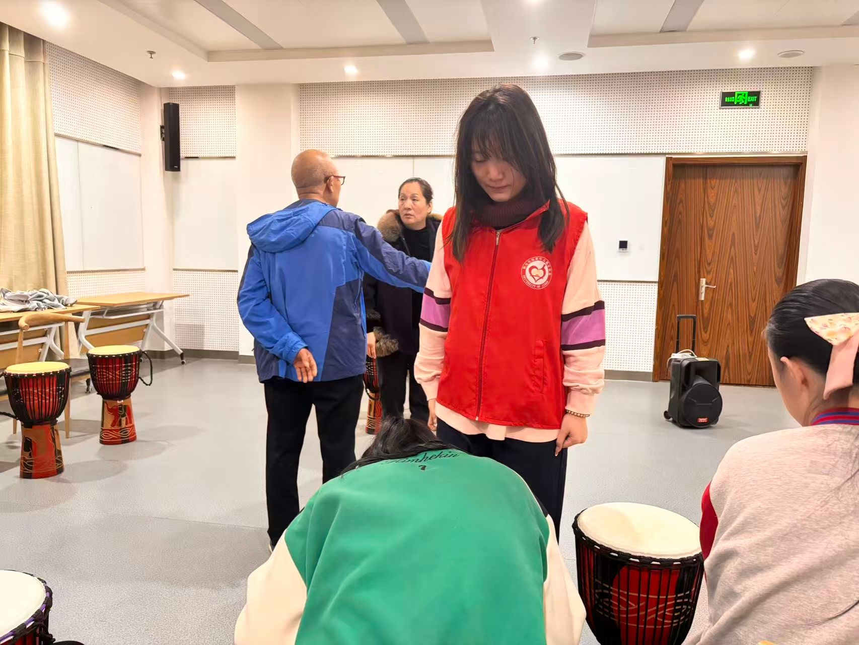 活动现场氛围轻松愉悦,志愿者们分工明确、配合默契。活动伊始,志愿者们小心翼翼地将非洲鼓搬运至场地并摆放整齐,确保活动顺利开展。签到环节中,志愿者们面带微笑引导参与者入场,耐心解答各类疑问,同时细心维持现场秩序。随着专业老师的引导,鼓声缓缓响起,志愿者们协助老师带领大家敲击节奏,激昂与舒缓交织的鼓点极具感染力。孩子们闭目聆听,嘴角不自觉扬起笑意,跟着节奏轻轻摆动身体,眼中闪烁着喜悦的光彩。志愿者们穿梭在人群中,轻声给予鼓励,帮助每个孩子沉浸于音乐疗愈的魅力,让善意在每个鼓点中传递。