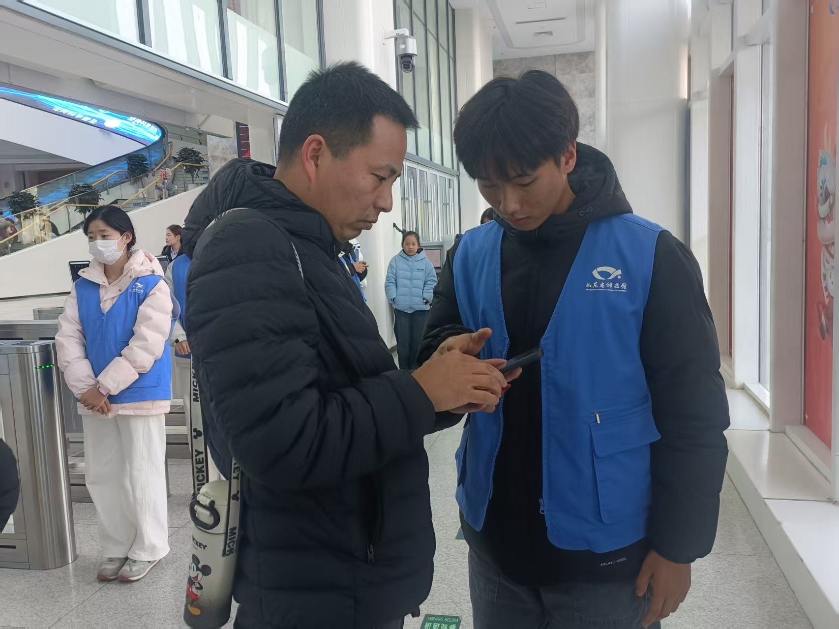 活动当日,志愿者们身着蓝色马甲,在工作人员统筹安排下投入服务活动。集合后,大家迅速进入岗位:目光紧随时闸机前的人流,随时准备协助操作;遇使用智能手机不便的老人,便轻声讲解操作步骤、耐心引导完成流程;碰上手忙脚乱的随行家长,主动接过证件协助核验,帮助其快速通过通道。行进途中,带队负责人同步提醒服务细节,引导志愿者们在实践中落实“主动、细致、高效”的服务准则。场馆入口区域秩序井然,志愿者的贴心服务,收获了游客的频频赞许与真诚致谢,原本冰冷的闸机,也成了连接志愿善意与公众温度的纽带。