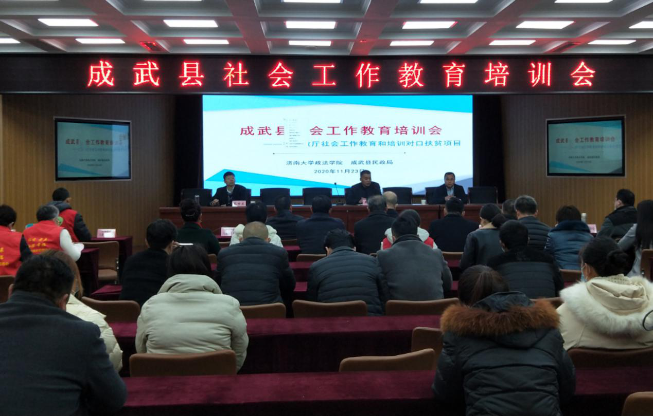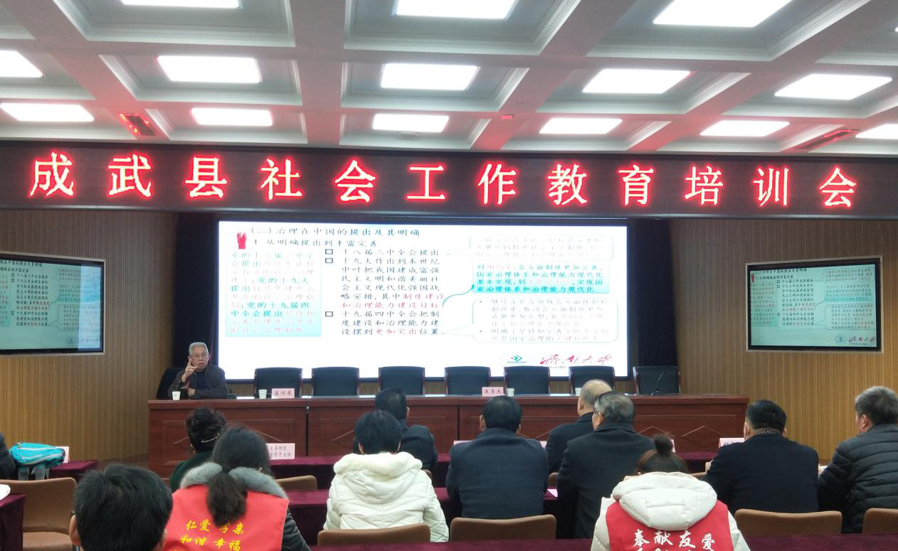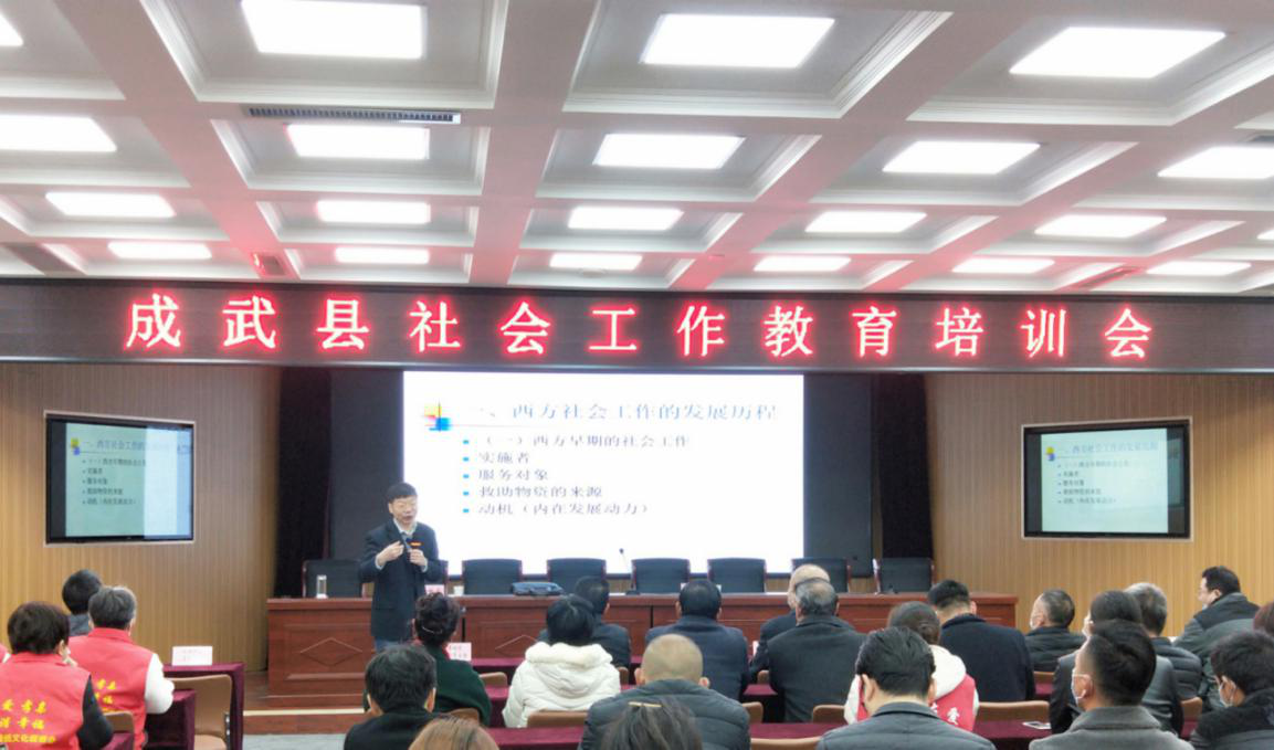 与成武县民政局在县社会福利中心联合举办社会工作教育培训会。参会人员为县民政局全体同志、各社会组织法人(负责人、财务人员、一线工作者)、社工及志愿者、城乡儿童督导和儿童主任、城乡社区工作者,总计100余人。